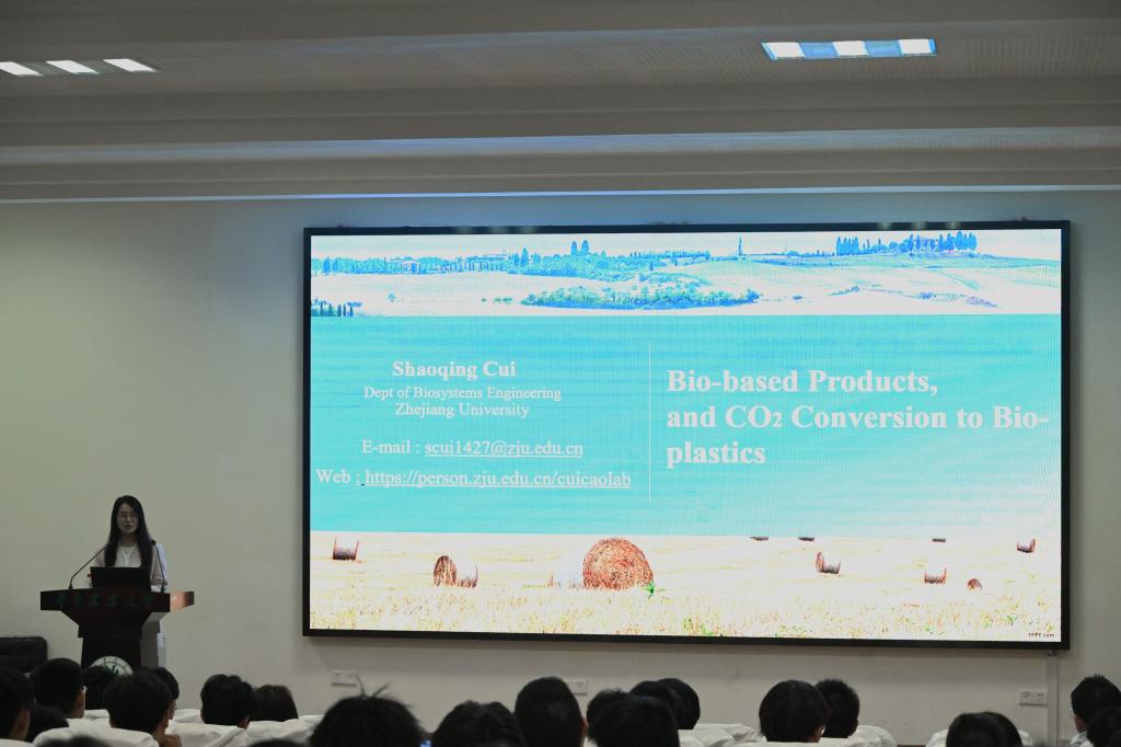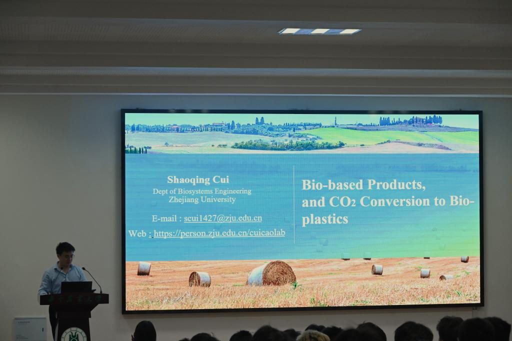“今晚我们就以朋友的方式来交流。”崔绍庆研究员首先分享了自己多年的学习科研经历以及成果。崔研究员分享了各项生物质基材料及其应用研究,包括基于生物基胶黏剂,泡沫,涂料,以及二氧化碳基高分子产品。此类生物质产品可制备成可降解地膜和食品包装盒等,体现了“取之于自然、还之于自然”的科学思想。