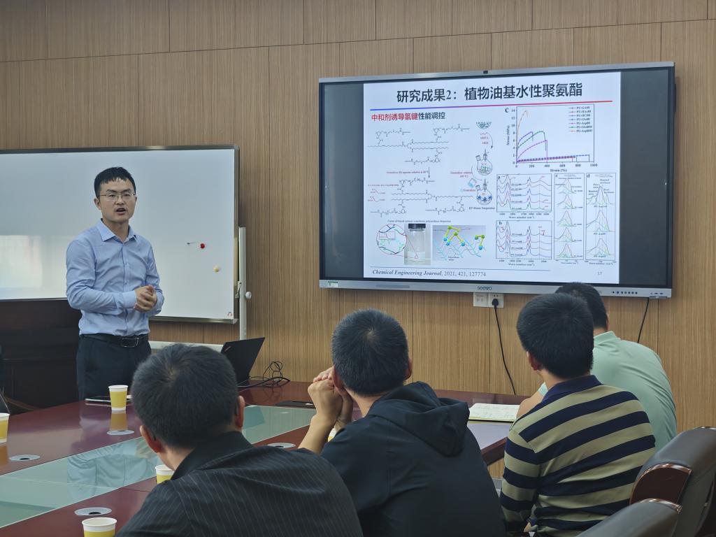 讲座伊始,张教授介绍了植物油脂、植物油脂的研究现状以及植物油生物质高效转化及其高值化利用的各类研究成果。他谈到,运用热诱导、UV诱导以及电诱导羟基化的方法对植物油脂的性质进行改善,以天然产物及其衍生物等可再生资源为基础合成的水性聚氨酯具有节约能源和保护环境的多重功效,为实现高分子材料的可持续发展提供了研究方向。