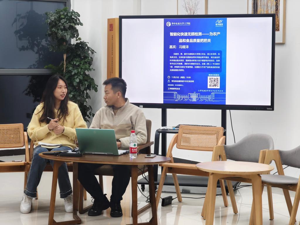 11月23日晚,以智能化快速无损检测为主题的学术晚茶活动在员工综合服务楼103举行,bevictor1946韦德官网机电系副主任冯耀泽副教授与在场60余名同学交流讨论智能化无损检测在农产品和食品中的研究和应用。