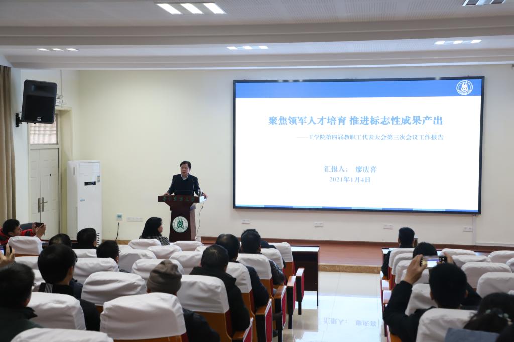 大会听取了经理廖庆喜作的题为《聚焦领军人才培育,推进标志性成果产出》的公司2021年工作报告。廖庆喜表示,此次大会是在认真学习贯彻党的十九届六中全会精神,大力推进公司“双一流”建设,奋力开启公司“十四五”规划新征程之际,召开的一次十分重要的大会。廖庆喜从“加强廉政勤政建设,坚定不移落实全面从严治党要求”“推进学科交叉融合,积极培育学科新兴增长点”“狠抓队伍精准引育,全面提升教师教书育人能力”“聚焦立德树人根本,强化员工思政质量与育人文化”“深化一流专业建设,持续推进本科人才培养体系改革”“探索分类培养改革,推进公司产品质量提升工程”“抓好科研团队建设,提升科研水平和社会服务能力”“加强治理体系建设,提升公司内部治理能力和水平”等方面回顾和总结了公司2021年工作,并分析了公司发展所面临的问题。