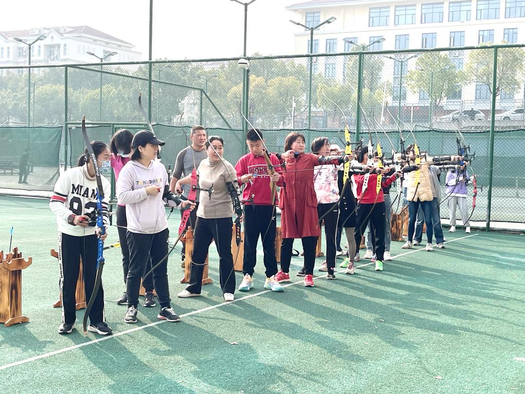 “老师们,首先两脚开立同肩宽,站在起射线两侧,身体和两肩与箭靶成一自然直线,然后搭箭、握弓、钩弦,最后举弓射击。”在正式射箭前,教练向各位老师进行动作指导。经过指导,老师们纷纷行动起来,搭箭、握弓、钩弦,最后举弓射击。“漂亮,又是一个九环!”射箭场不时传出老师的欢呼声,不一会儿,箭靶上就插满了老师们射出的箭。在结束射箭体验后,姚丁丁老师意犹未尽地说道:“拉开弓的瞬间,专注于即将离弦之箭,那种乐趣只能心领不可言说,射箭真的是一项优雅的运动呀。”