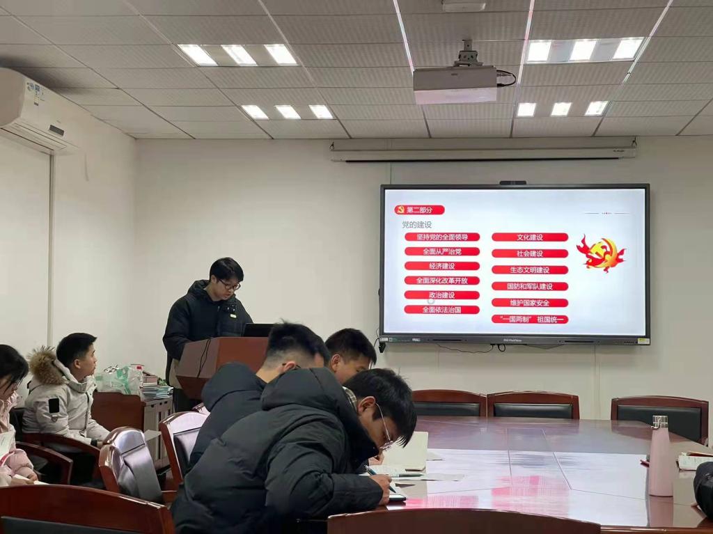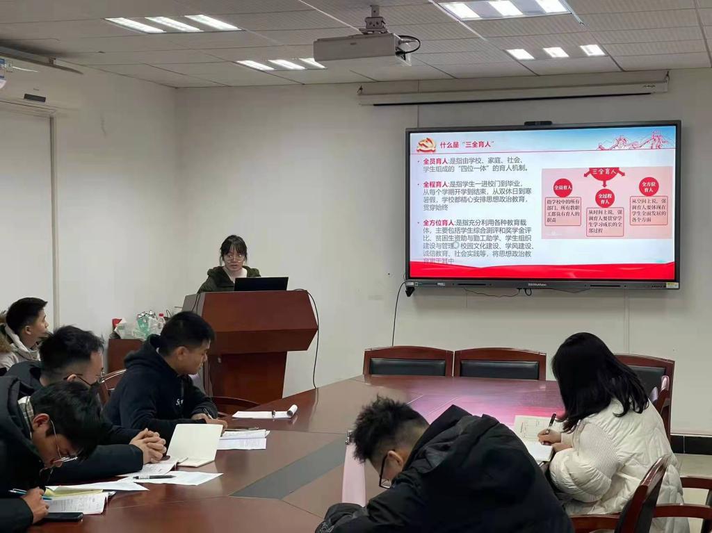 李晶同志领学《加强和改进“三全育人”工作实施意见》。她首先讲解什么是“三全育人”及“三全育人”思想的由来。接着谈到,立德树人是高校教育工作的重中之重。作为研究生党员,我们更要加强思想建设,将习近平新时代中国特色社会主义思想作为自己的行动指南,才能够更好的发展自身。