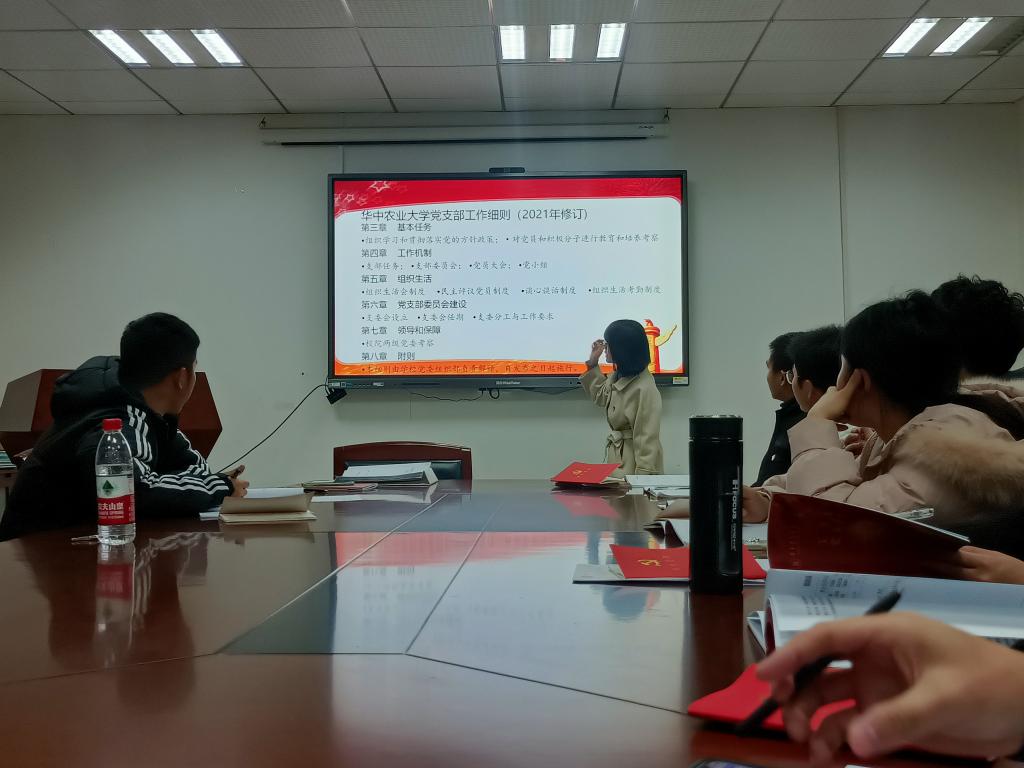 会议伊始,张诗伟同志带领支部成员重温入党誓词。李楚仪同志领学《bv1946伟德国际始于英国党支部工作细则(2021年修订)》,她围绕基本任务、工作机制、组织生活、党支部委员会建设、领导和保障及附则进行具体讲解。她提到支部要执行“三会一课”制度、民主评议党员制度、谈心谈话制度并严格执行组织生活考勤制度。