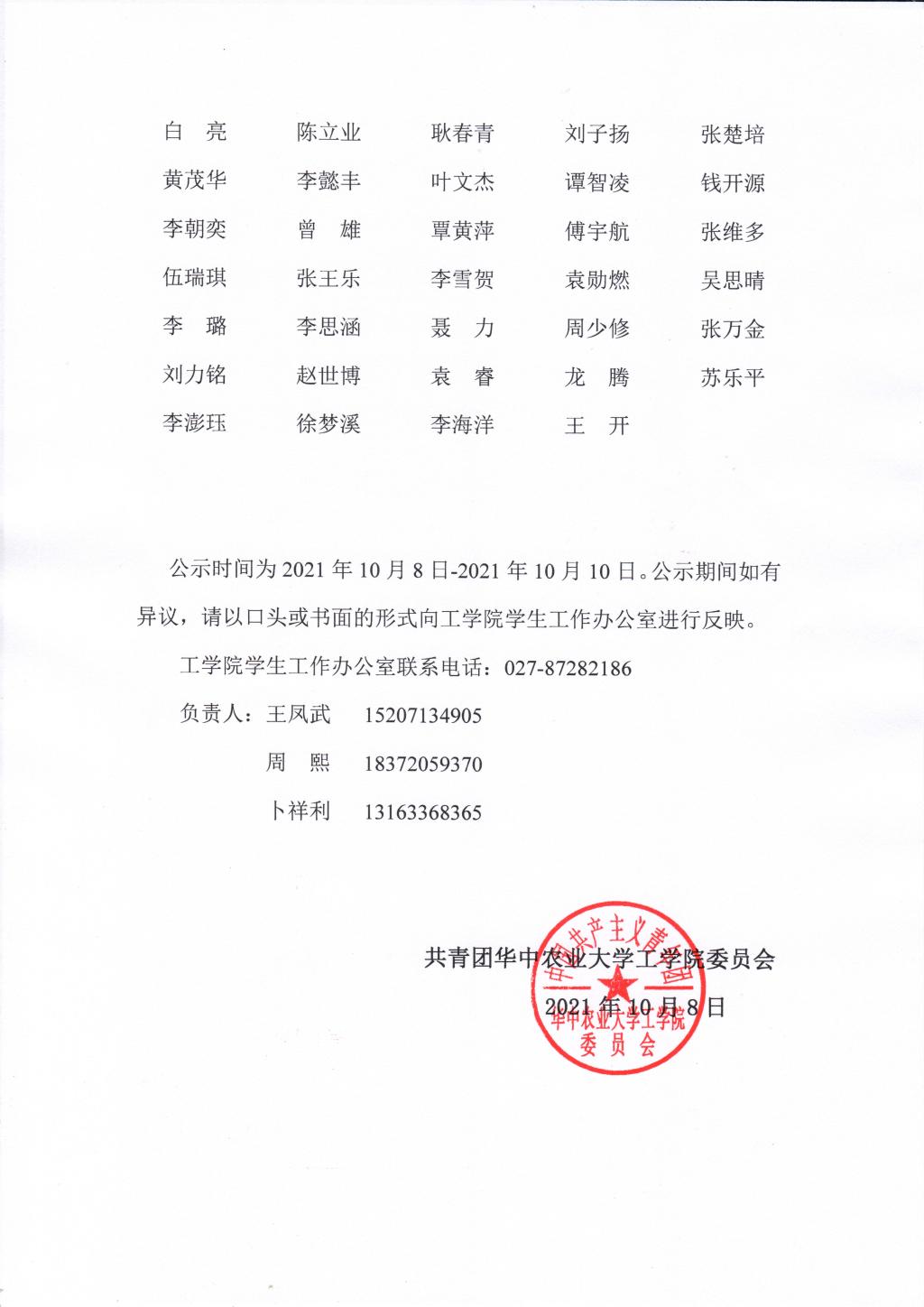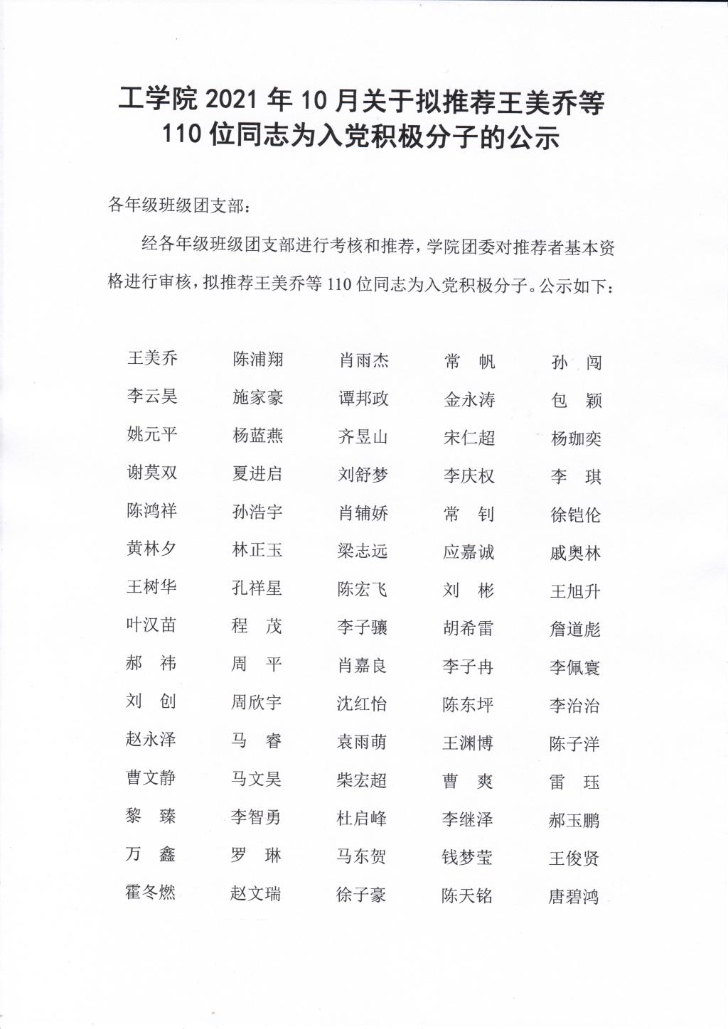 2021年10月关于拟推荐王美乔等110位同志为入党积极分子的公示