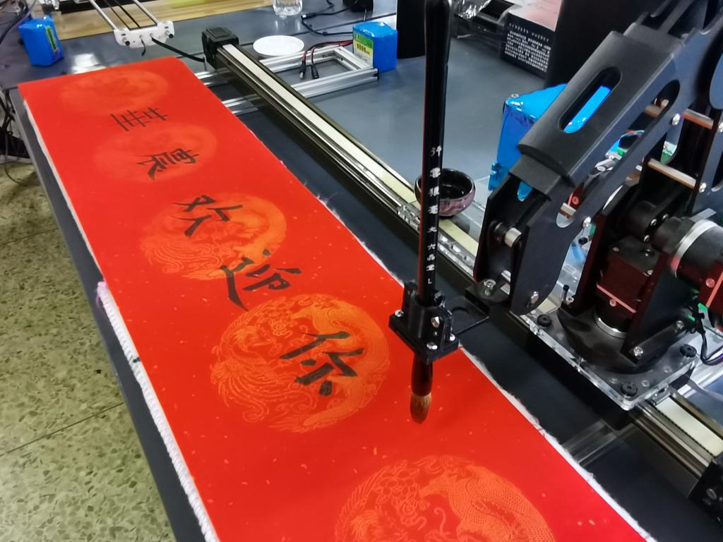 机器人“书法家”“手”握毛笔蘸上墨汁,在红色的对联纸上一笔一画地写下“华农欢迎你”。“老师,这个机器人还可以写其他字体吗?”有同学现场问道。“当然可以,我们的机器人不仅能写楷书,还能写草书、隶书等字体,如果给机械臂换上不同的夹具、导轨和后台编控制模块,表演琴棋书画等都不成问题。” 刘浩蓬老师向新生解释说。机械臂就像人的手和胳膊,运动轨迹规划、图像识别,人工智能算法等技术实现了人的大脑和神经的部分功能,让机器人书写过程中的起、承、转、折等细微动作惟妙惟肖。只需要短短几分钟,就可以写好一幅毛笔字对联。