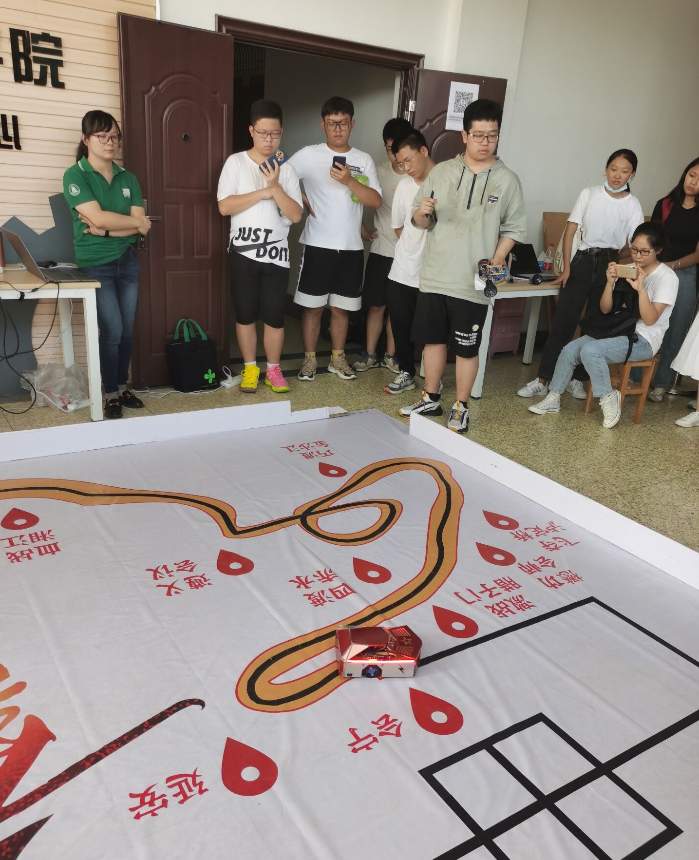 工科基地二楼,新生们围成一圈观摩沙盘上飞驰的智能小车。“车子竟然不用遥控就能沿着轨道跑,甚至还可以完成各种曲折的转向,这太神奇了”。新生们对智能小车表现出浓厚的兴趣,有同学表示希望自己今后也能加入智能小车实验室,将来能够亲手制作一辆智能小车。负责本次活动的卫佳老师介绍到,沙盘的主题是“长征之路”,小车在沙盘上的辗转腾挪象征着“在困难中前进”的长征精神,希望新同学们能够在历史中汲取前进的力量,未来将伟大的长征精神继承好、弘扬好。