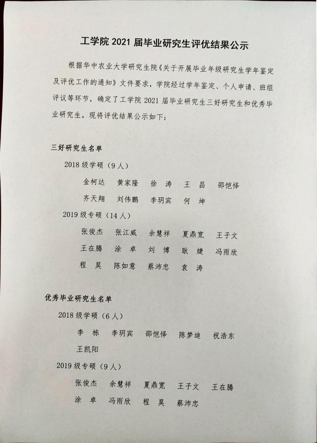 2021届毕业研究生评优结果公示