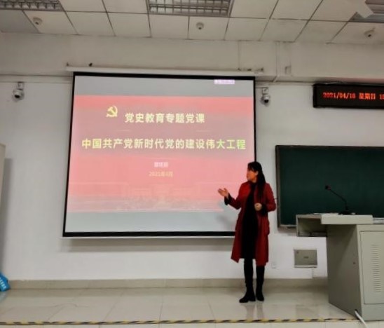 瞿明丽以2019级本科生沈旭东同学入伍,员工们戍边卫国、支援西部、在企业成长为中坚力量等故事为引,讲述了大家身边立志报国的故事。随后,她从党建设伟大工程的形成发展及其重大意义、新时代党的建设伟大工程的总体要求与主要内容、推进党建设新的伟大工程的实践与启示三个方面开展讲授,她通过理论宣讲、时政分析和丰富的视频相结合的方式,使授课内容生动多元、理论知识更加通俗易懂。