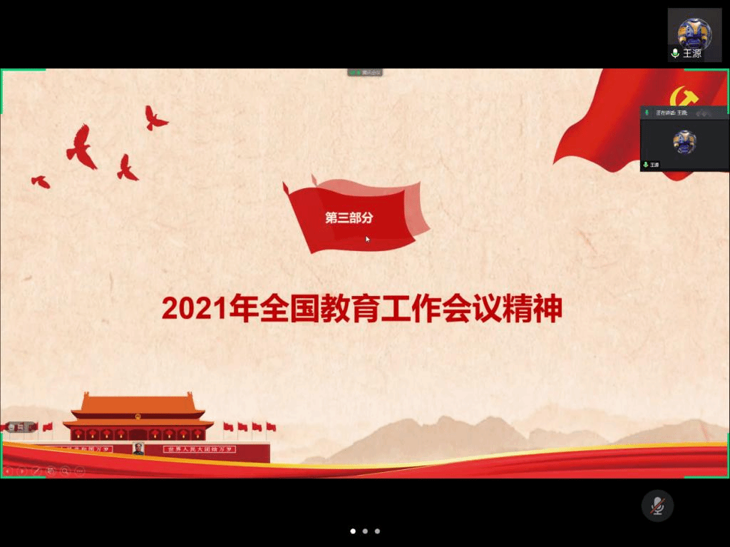 王源同志对2021年全国教育工作会议精神进行了传达与剖析。他说,我们要提升专业化能力,发扬钉钉子精神,旗帜鲜明讲政治,遵守一线规则,坚守安全底线,加强宣传引导。