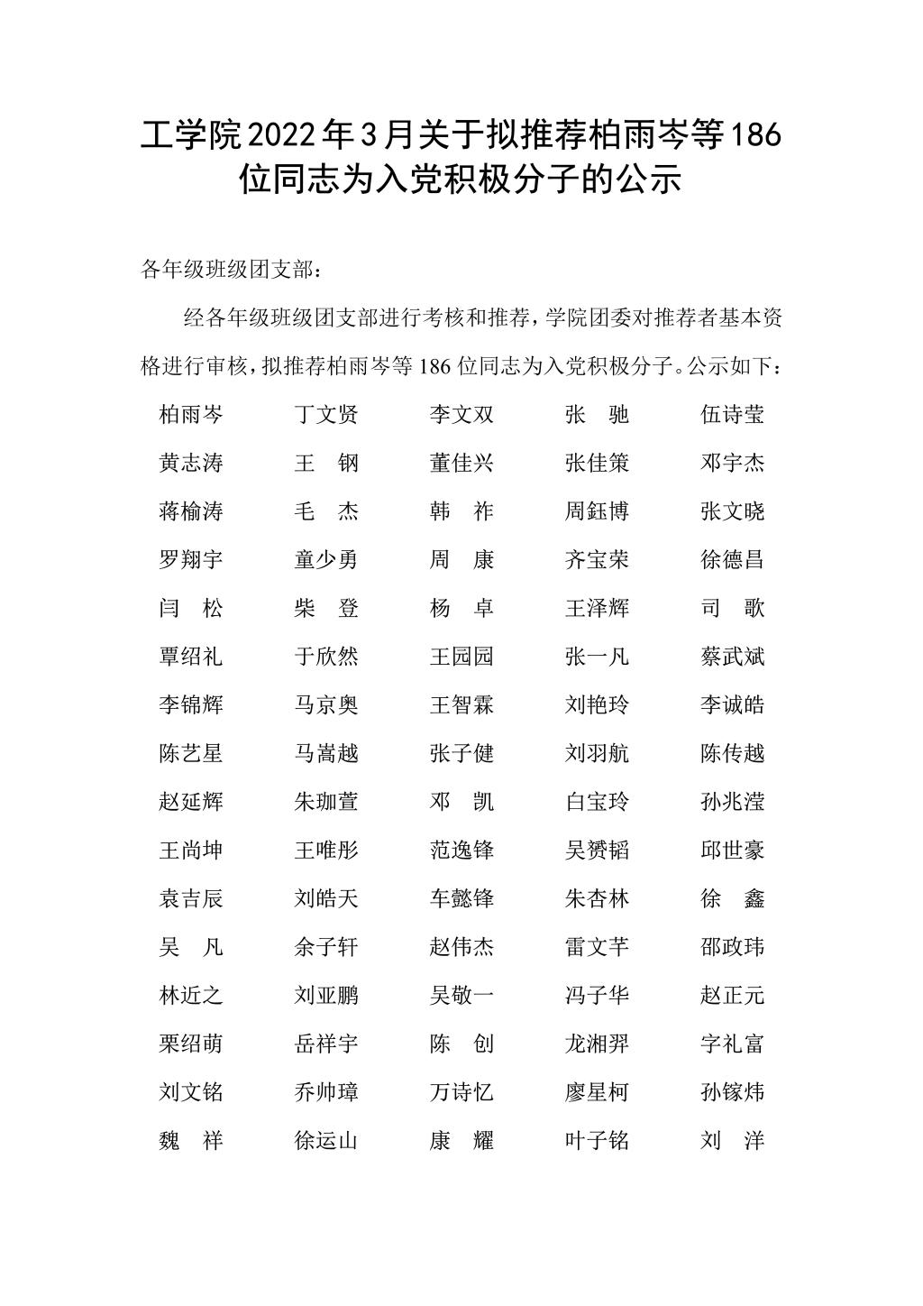 2022年3月关于拟推荐柏雨岑等186位同志为入党积极分子的公示