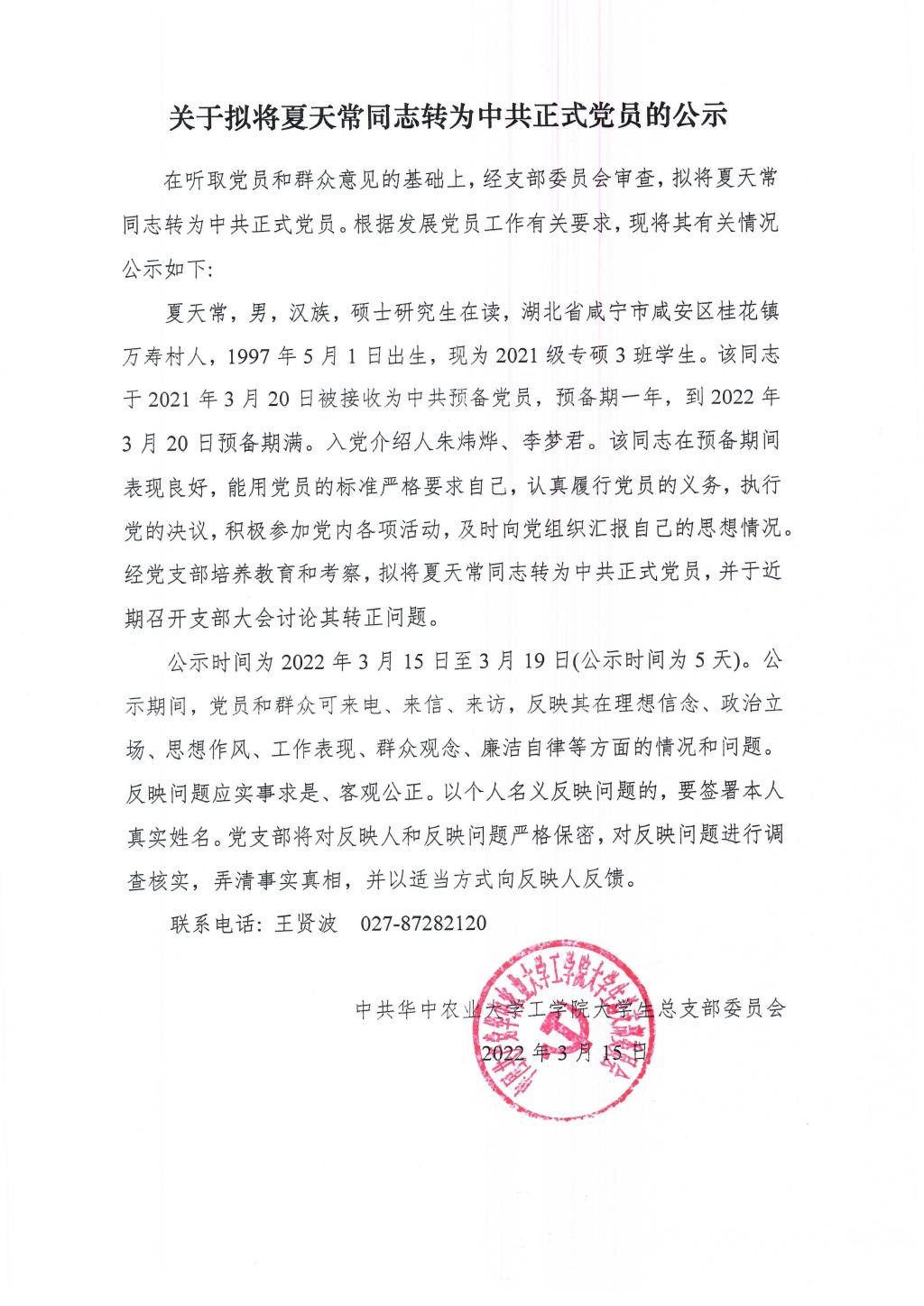 【研】关于拟将夏天常同志转为中共正式党员的公示