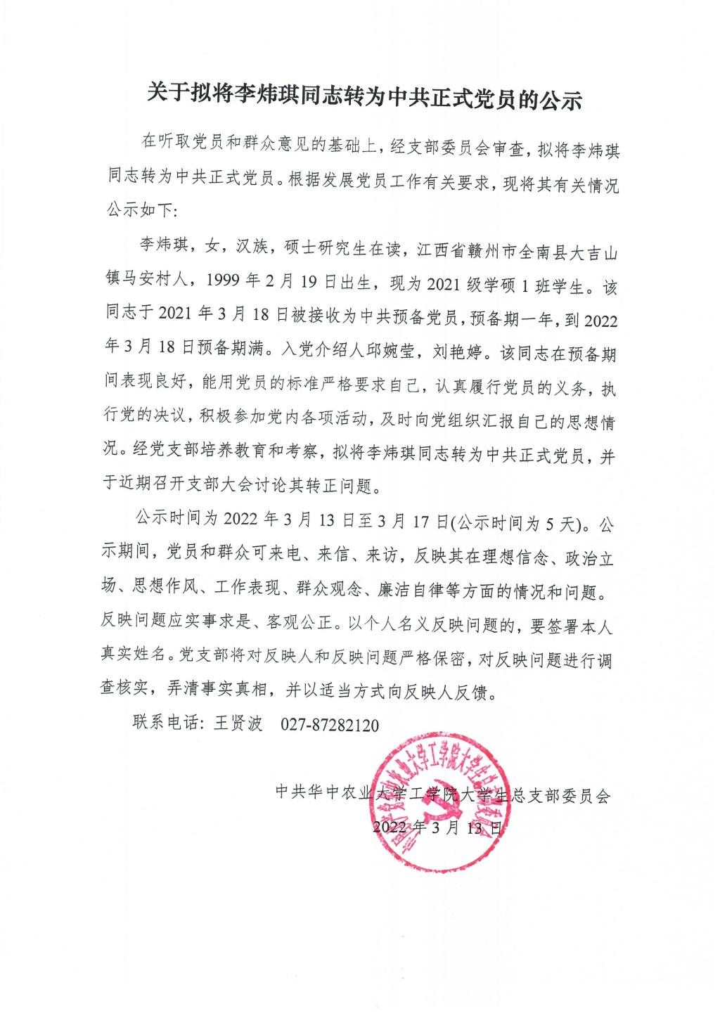 【研】关于拟将李炜琪同志转为中共正式党员的公示