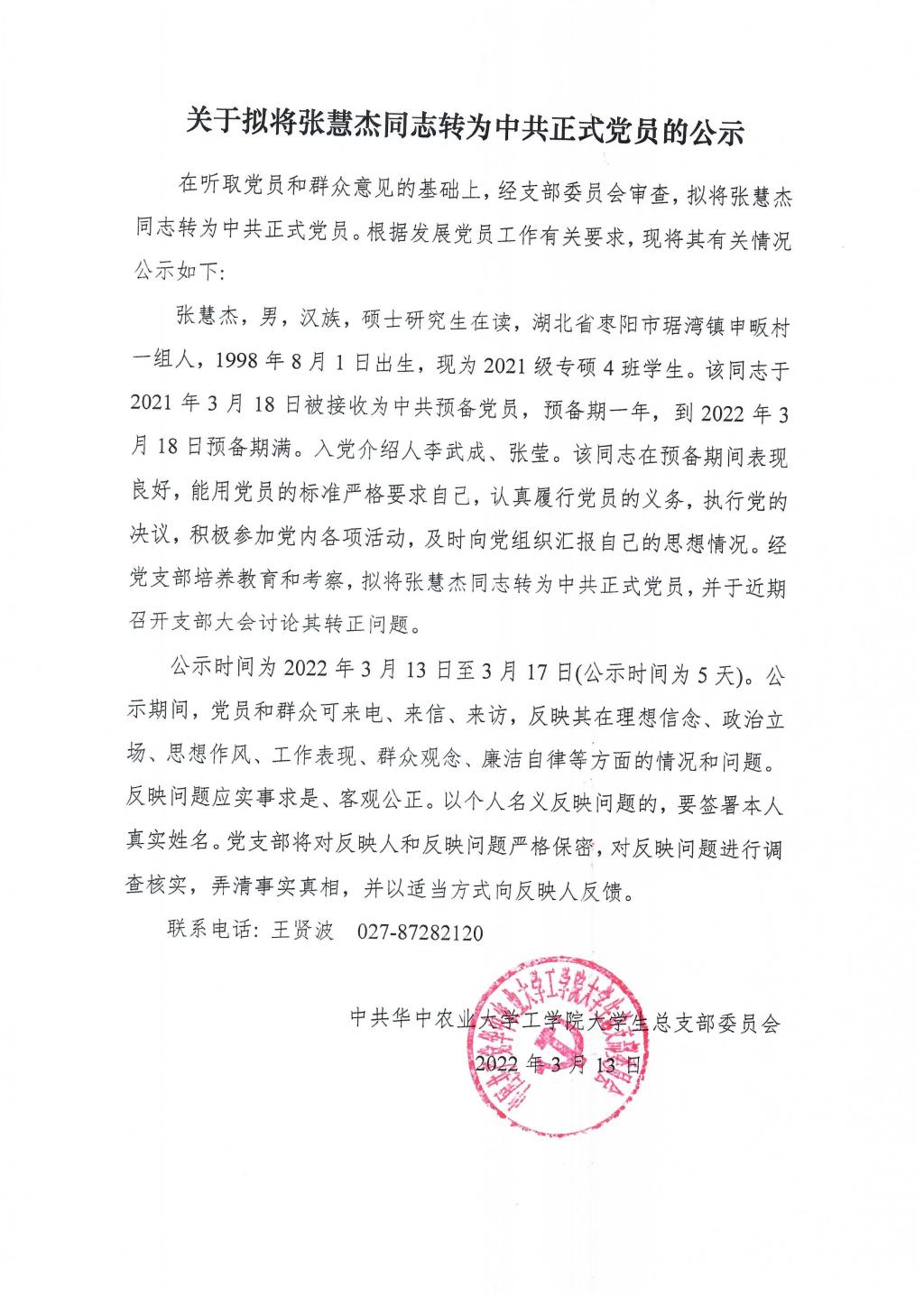【研】关于拟将张慧杰同志转为中共正式党员的公示