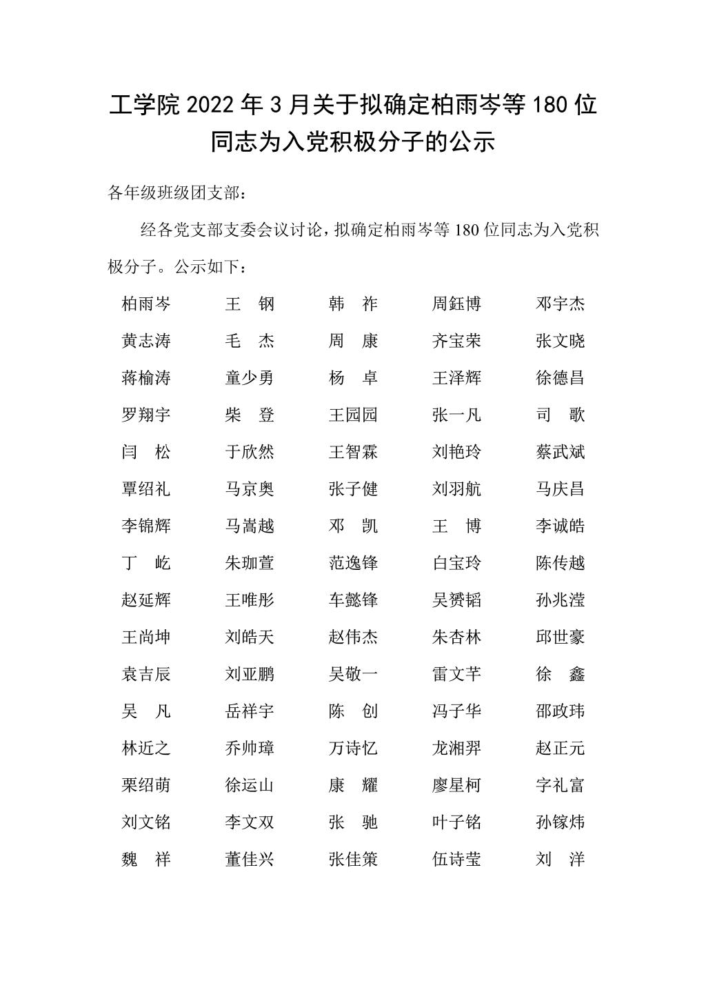 2022年3月关于拟确定柏雨岑等180位同志为入党积极分子的公示