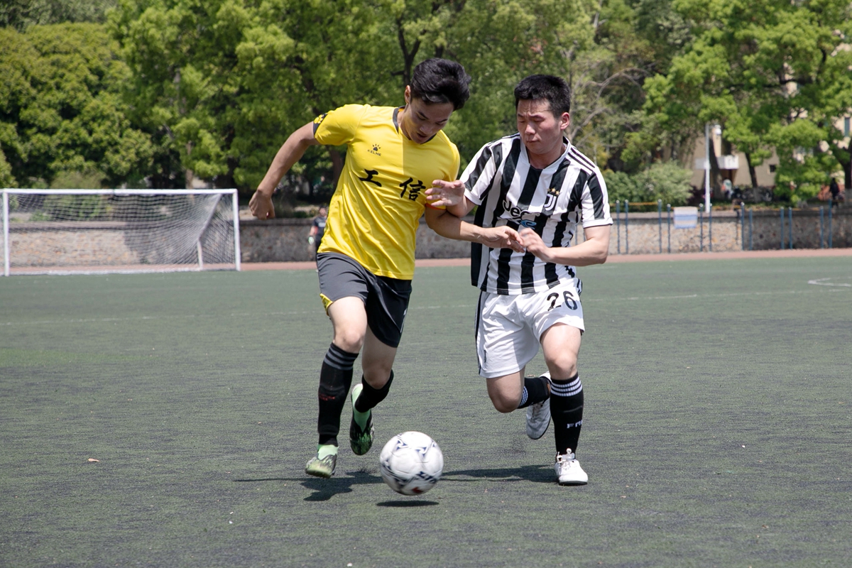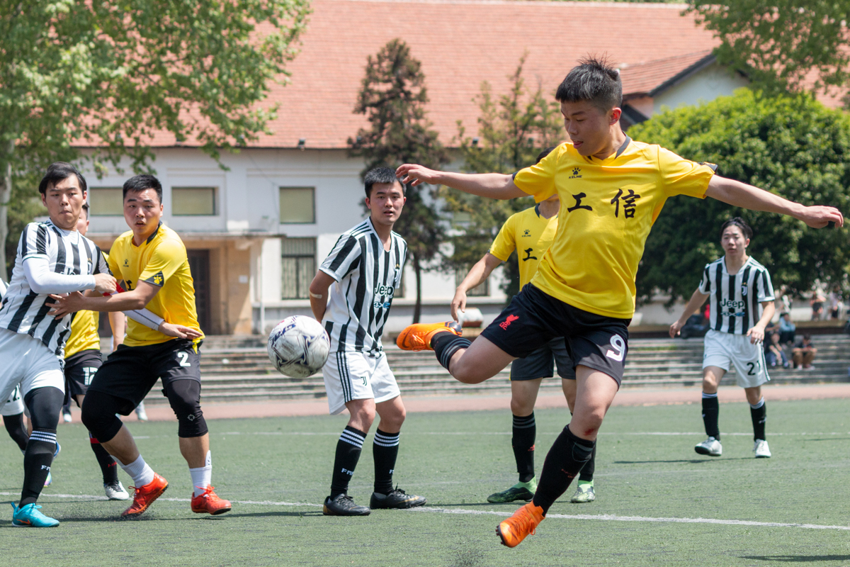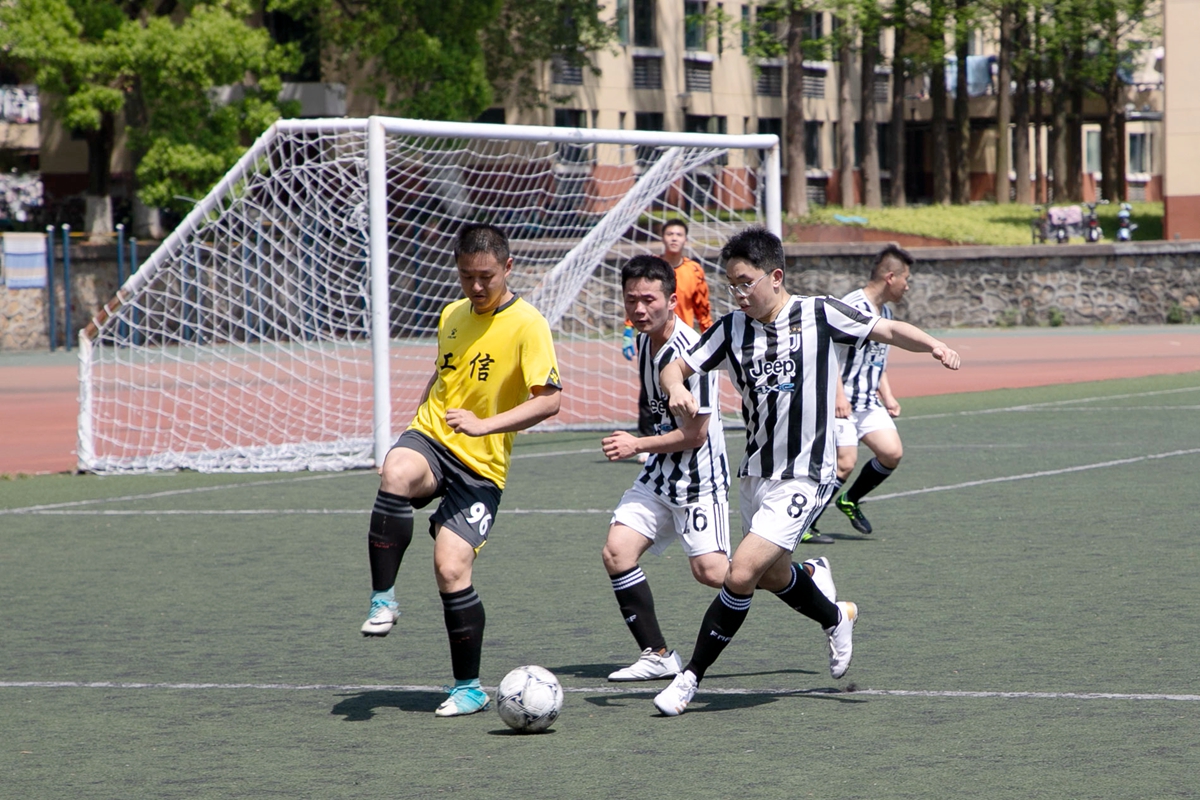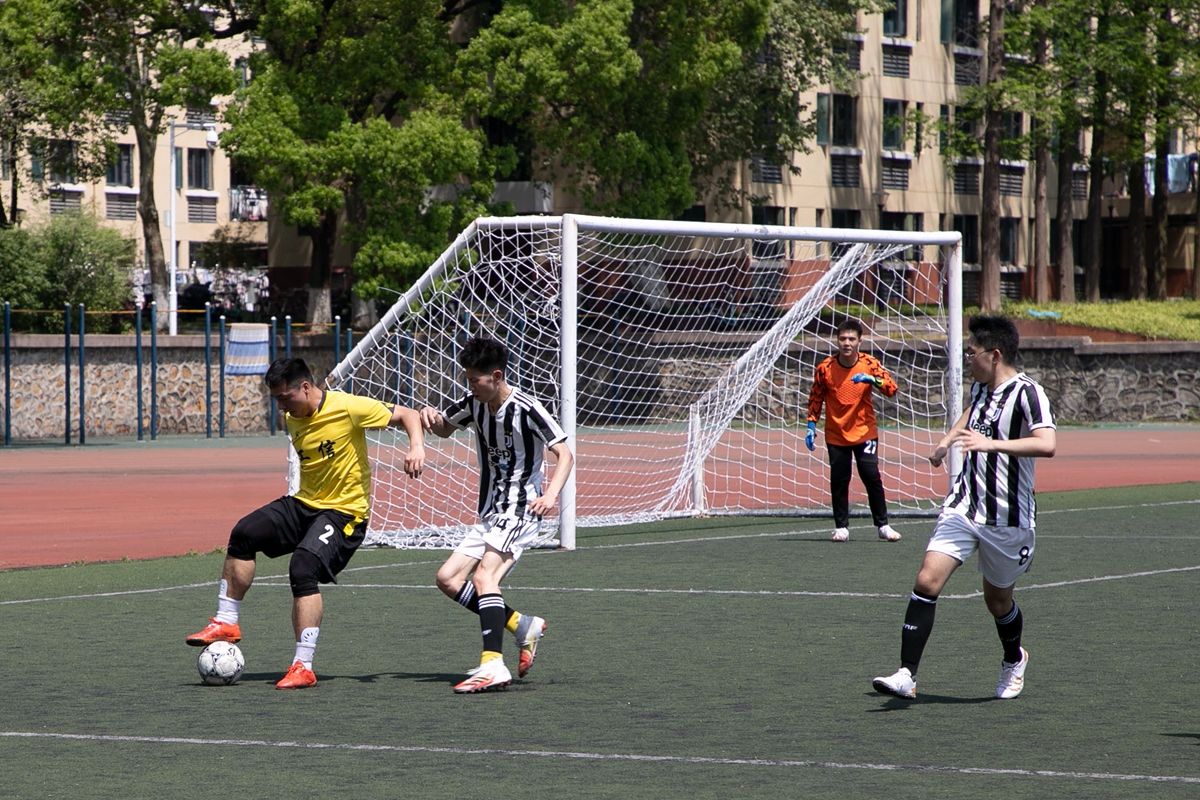 4月7日中午,2022“狮子山杯”足球赛(研究生)男足小组赛继续进行。在西运动场一场比赛中,身着黄色球衣的bevictor1946韦德官网、信息公司联队(工信联队)4:0战胜身着黑白间条衫的文法公司男足,取得开门红。