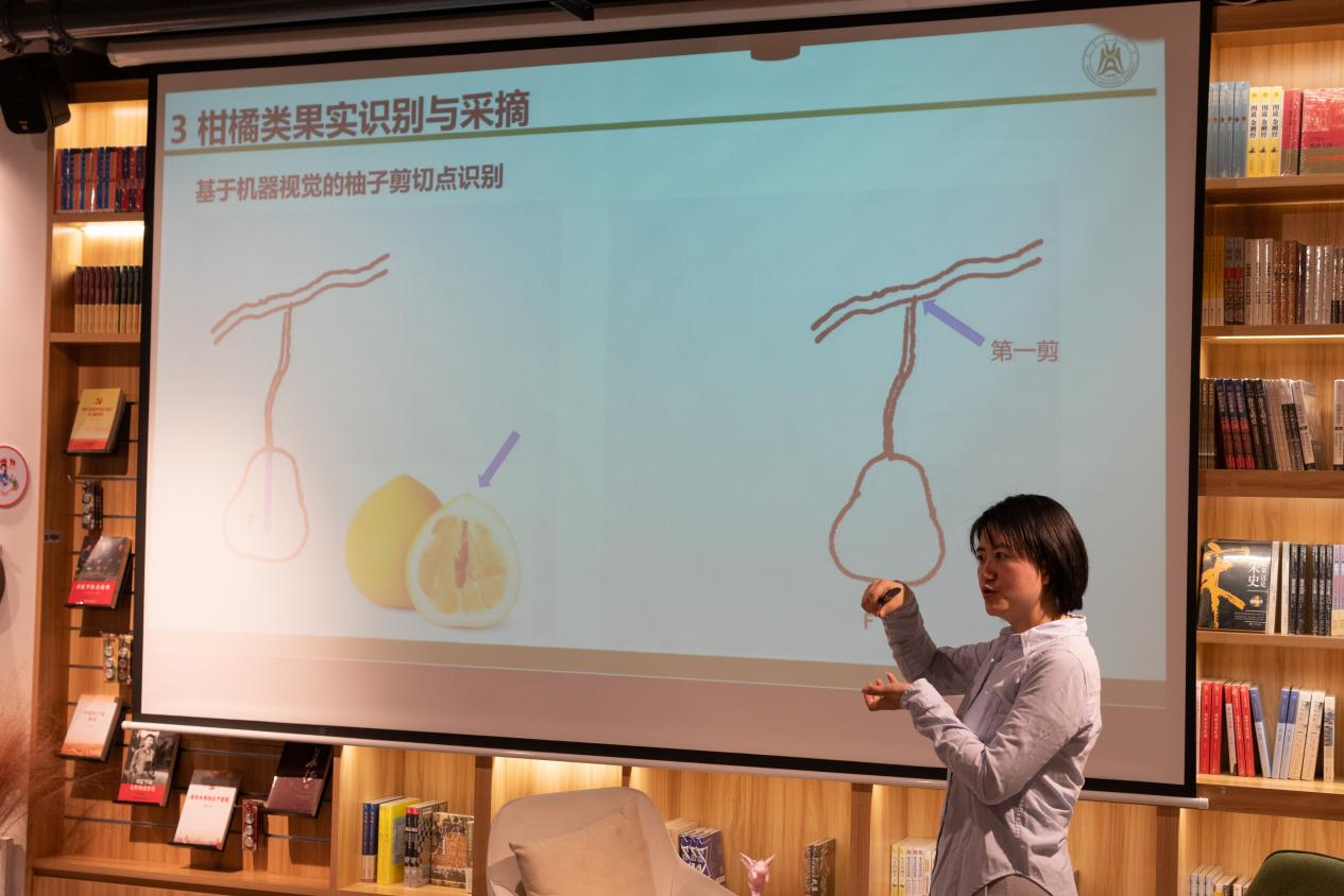 刘洁老师从我们常见的柚、橙、橘、柿、石榴等山地果实开场,介绍了我国山地果实的种植情况及特点。随后她结合学科特色从山地果园机械简介、山地果园机械智能化、柑橘类果实识别与采摘等三个方面展开阐述。