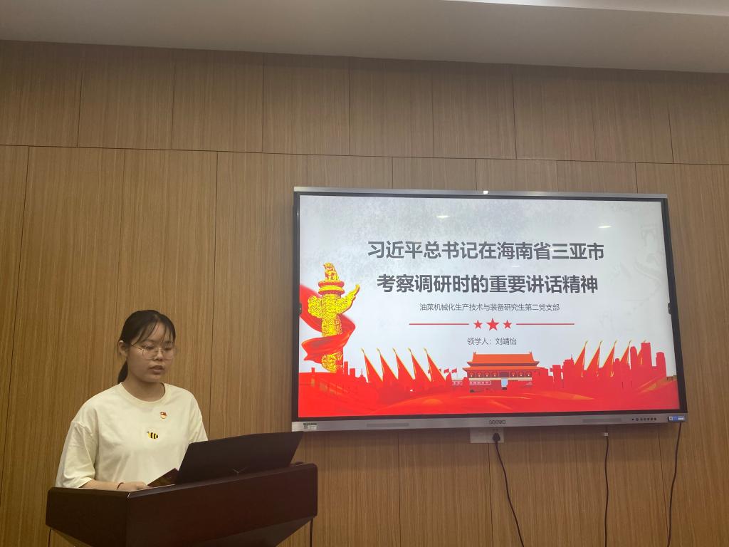 刘靖怡同志领学习近平总书记在海南省三亚市考察调研时的重要讲话精神时分享到,习近平总书记在崖州湾种子实验室进行考察时,关心中国人民的菜篮子安全,作为研究生党员,我们应该将汗水播撒在祖国大地上,用科技武装农业生产,保障粮食安全,针对当前农业机械的短板项目集中攻关,努力实现在乡村振兴中建功立业的目标。