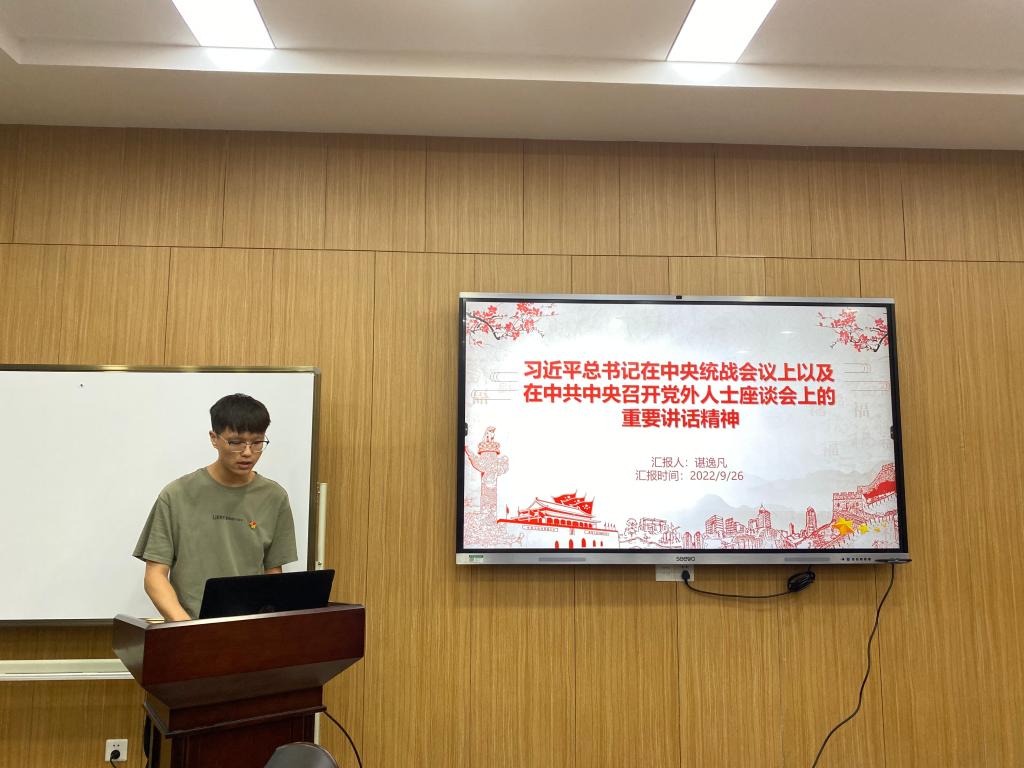 谌逸凡同志带领支部成员解读习近平总书记在中央统战会议以及在中共中央党外人士座谈会上的重要讲话精神时讲到,积力之所举,则无不胜也;众智之所为,则无不成也。作为社会主义新青年,我们要把思想和行动统一到习近平总书记在中央统战会议的重要讲话精神上来,深刻领悟“两个确立”的决定性意义,不断增强“四个意识”、坚定“四个自信”、做到“两个维护”,结合实际抓好各项任务贯彻落实,为把我国建设成为富强民主文明和谐美丽的社会主义现代化强国、实现中华民族伟大复兴的中国梦不懈奋斗。