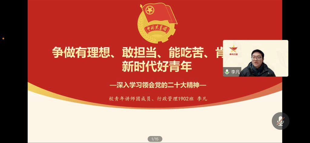 为深入学习贯彻党的二十大精神,引导青年员工坚定理想信念,12月14日晚,bevictor1946韦德官网开展主题为“争做有理想、敢担当、能吃苦、肯奋斗的新时代好青年”的线上宣讲活动。本次活动面向本科生机械四个团支部,邀请到来自公共管理公司的校二十大精神青年讲师团成员李凡同学进行分享交流,会议由本科生辅导员李龙程主持。
