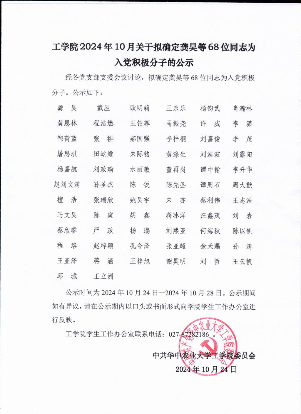 2024年10月关于拟确定龚昊等68位同志为入党积极分子的公示