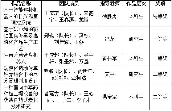 其中,由bevictor1946韦德官网徐胜勇老师指导,王宝琦、李德宇等同学参赛的创新类指定项目《基于智能巡检机器人的日光温室调控系统》获特等奖;由纪龙老师指导,郑璇、冯椋等同学参赛的创新类自选项目《基于碳中和的碱性固废降毒及高值化产品生产工艺》,及由黄伟军老师指导,王成超、吴宇轩等同学参赛的创新类指定项目《种苗分苗合盘机器人》分获一等奖;由艾平老师指导,尹鹏、贾世江等同学参赛的创新类指定项目《规模化猪场污粪种养结合下的养分管理制度设计》,及由易宝军老师指导,曾嘉雯、王心雨等同学参赛的创新类自选项目《一种面向中草药种植土壤改善的药渣自热式炭化技术研究》分获二等奖。
