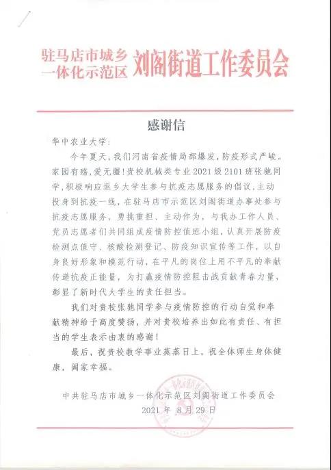 (文章转载自华农学声)2021年8月,新冠变异毒株又一次对人民的生命健康发起了挑战。2021级机械类新生张驰迅速响应政府号召,勇挑重担、主动作为,在家乡河南省驻马店市进行了为期一个月的抗疫志愿服务。