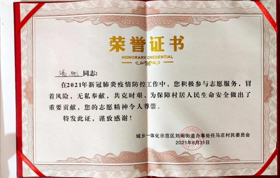 一个月的抗疫志愿服务结束时,因为表现突出,张驰收到了村委会的表彰。他说“在风雨中坚守后,我们一起等来了晴天!千家万户的安宁真的来之不易,守护这份安宁的其实就是我们每个人。”他还表示,这次社会实践,丰富了自己的人生经历,锻炼了自己的工作能力,更让自己体会到了个人价值与集体意义是能够深度融合的,员工身份与社会身份是能够深度融合的。