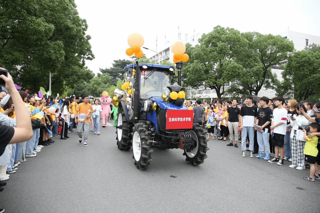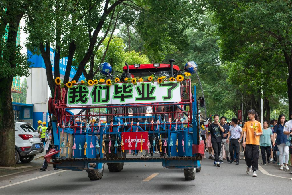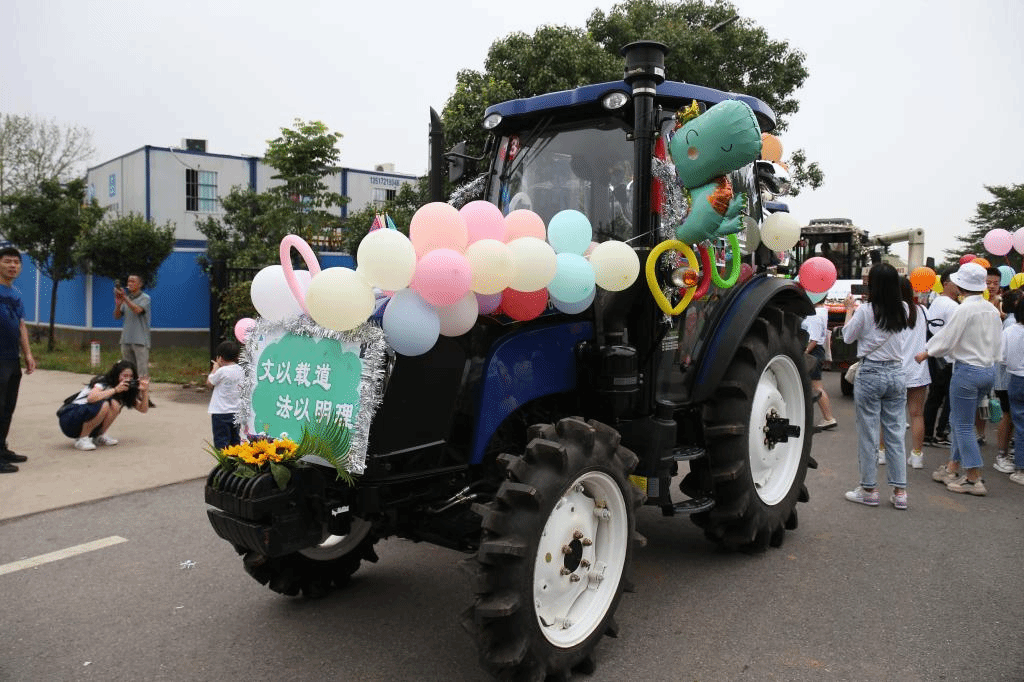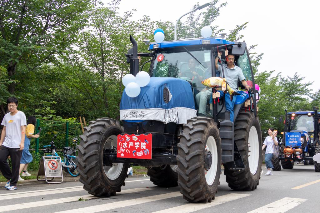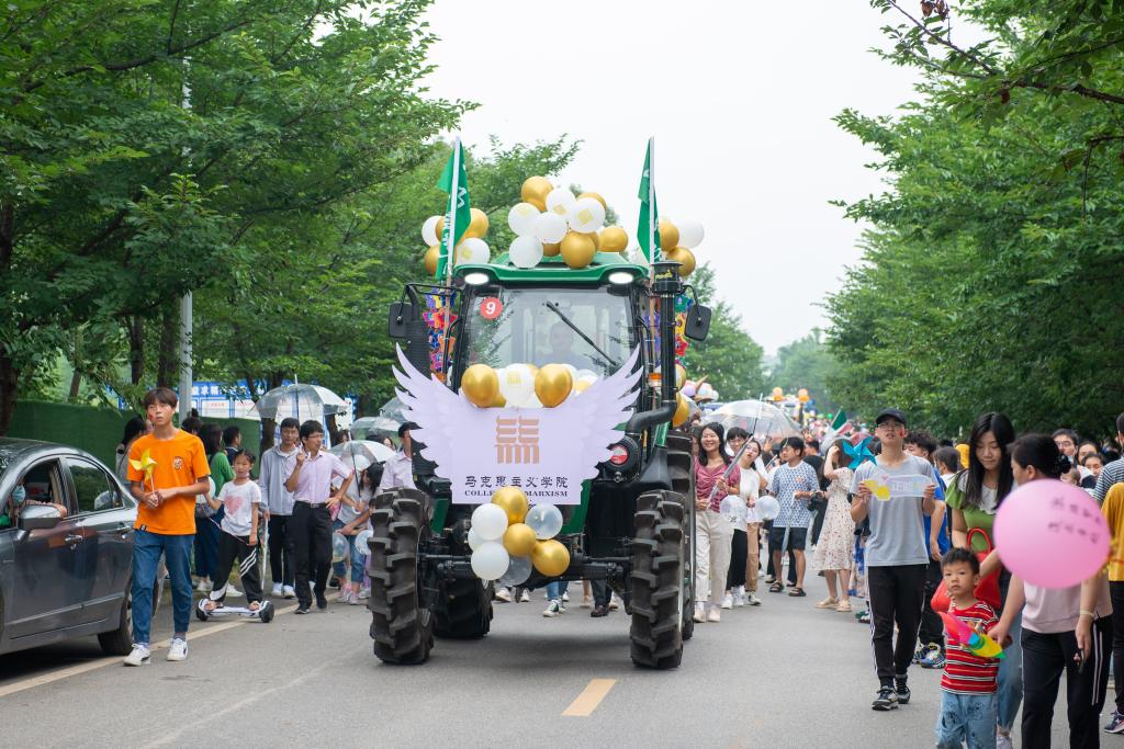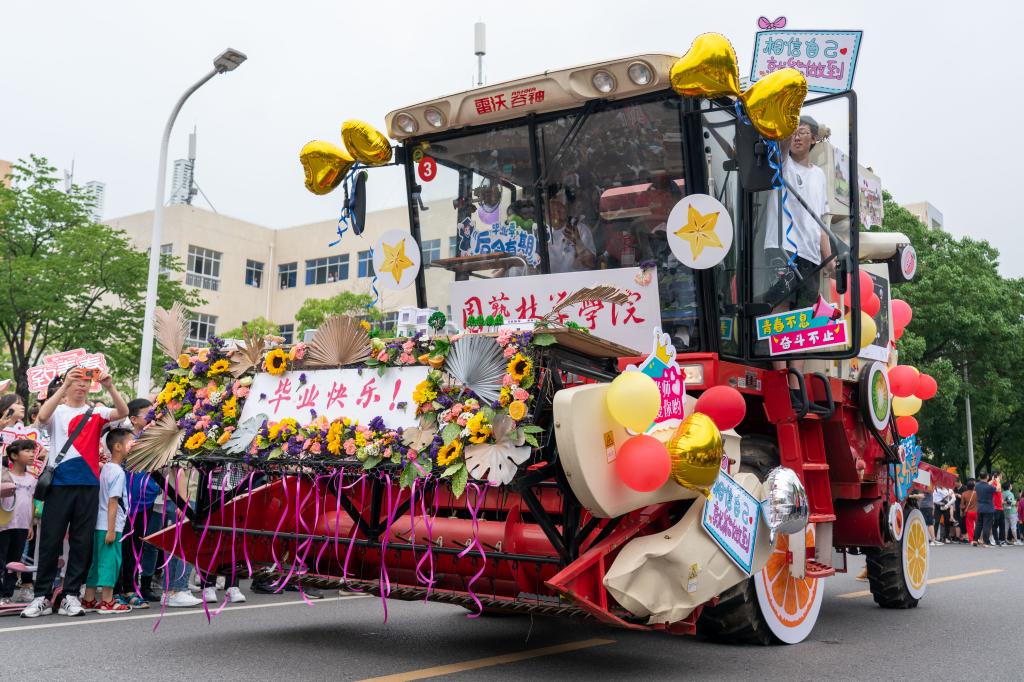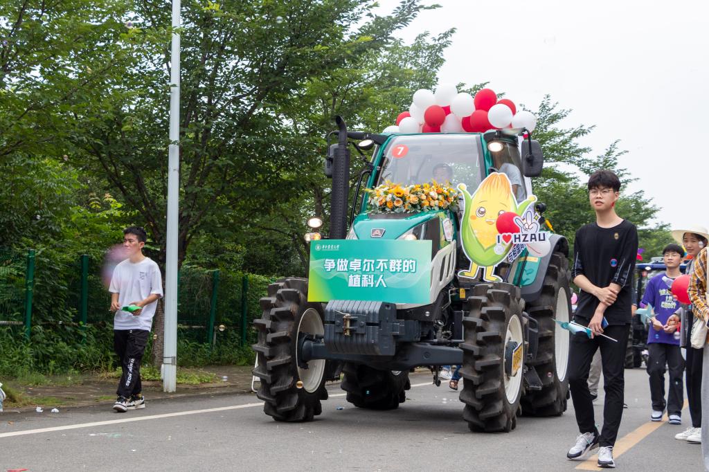 各具特色的巡游队伍与机车装扮吸引了师生们的目光。作为“排头兵”,bevictor1946韦德官网毕业生们伴随歌声踏着轻快的舞步出发,纽荷兰CX6.80联合收割机“大黄蜂”紧随其后,机车上,董事长李召虎挥舞着校旗,不时与巡游的师生们热情互动。偌大的机身上,张贴了象征工业发展的锤子、扳手、螺母等图案,寓意华农学子不断发扬大国工匠精神,心系天下、勇于挑战,在科技创新领域中建功立业。理公司则为机车两侧插上了贴有275张毕业生照片的巨型翅膀,机车前端迎风立有“展翅高飞”四个大字,寓意毕业生展翅高飞,前程似锦。园艺林学公司则以“上海青”和柑橘雕刻成的花瓣模型与鲜花一起,将车头装点成“园艺林学公司”字样,车身与车轮上,春分、夏至、秋分、冬至四个节气的花果图案与精美的插画、各具特色的印章错落有致地张贴着,体现了师生们的团结奋进及公司为持续创造美好生活而付出的努力。水产公司将机车车头装饰成蓝色鲸鱼模样,引擎盖上多彩气球将车头装点成喷泉状,机车身后是一张形如披风的“捕梦网”,网上挂满了毕业生们老员工活的点滴和感悟,寓意毕业生们在新的广阔海洋畅然遨游。植物科学技术公司毕业巡游花车以“感恩·继续前行——争做卓尔不群的植科人”为主题,通过麦穗、玉米等系列元素的装扮,寓意毕业生牢记国家和公司的殷切嘱托,以强农兴农为己任,做卓尔不群的植科人。动科动医公司机车以牛的形象进行整体设计,车头最前方,小猪玩偶和动物疫苗的立体形象赫然醒目,代表了华农“六个一”中的优质种猪和动物疫苗,寓意毕业生们传承创新、创造、创业精神。经济管理公司则以《国富论》《资本论》两本经管类学科经典读物装饰着车窗,机车两侧的风车迎风转动,毕业生们则骑车紧随其后,寓意毕业生在追逐人生梦想的道路上永葆前进动力。