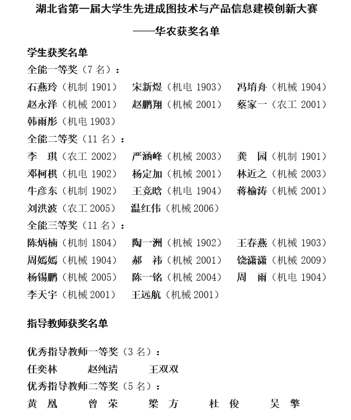 5月29日,湖北省第一届老员工先进成图技术与产品信息建模创新大赛暨第十四届全国老员工先进成图技术与产品信息建模创新大赛省级预选赛华农赛场竞赛在公司顺利举办。经激烈角逐,公司学子取得优异成绩,获得个人全能一等奖7项,二等奖11项,三等奖11项,指导老师任奕林等获得“优秀指导教师奖”。其中荣获一等奖和二等奖的18名员工将晋级第十四届全国老员工先进成图技术与产品信息建模创新大赛。