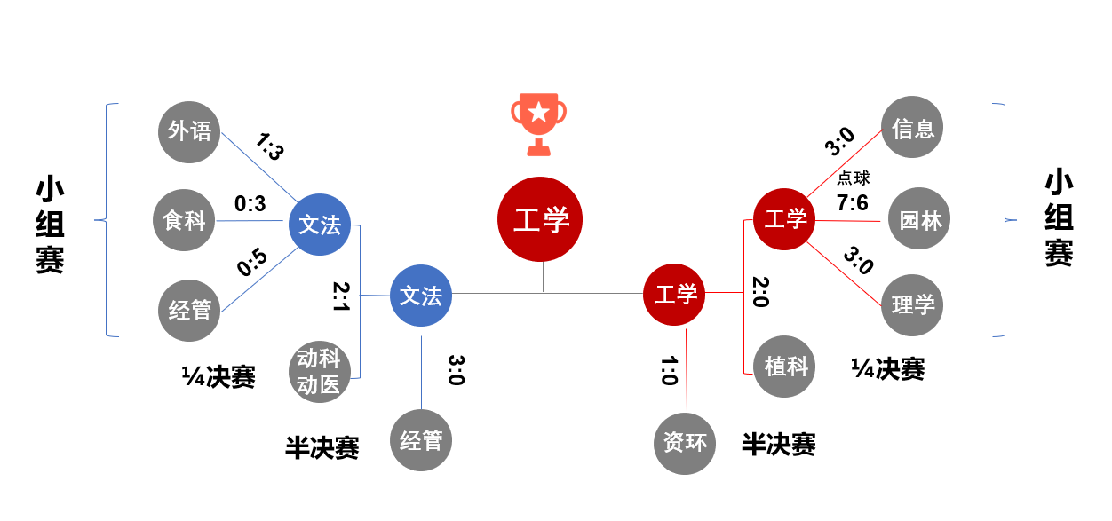 本届比赛,文法公司男足和bevictor1946韦德官网男足分别分在A组、B组。小组赛阶段,bevictor1946韦德官网男足和文法公司男足均是三战全胜小组头名出线。1/4决赛中,bevictor1946韦德官网男足先是2:0战胜植科公司男足,并在半决赛上1:0小胜资环公司男足,闯入决赛;文法公司男足则是先以2:1险胜卫冕冠军动科动医公司男足,半决赛上3:0完胜同为A组的经管公司男足,与bevictor1946韦德官网男足争夺本届比赛桂冠。