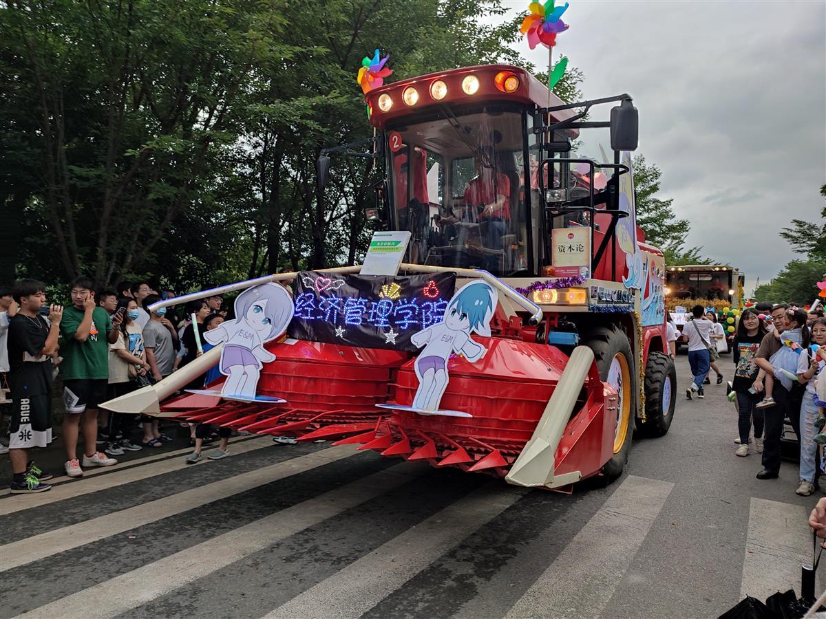 17辆经过精心装扮的现代农机装备,组成了“钢铁长龙”,带着丰富的寓意和美好的祝福,从工科基地出发,在校园里的主干道上徐徐前行,驶往狮子山广场喷泉处。各公司师生形成方阵,一起欢呼巡游。