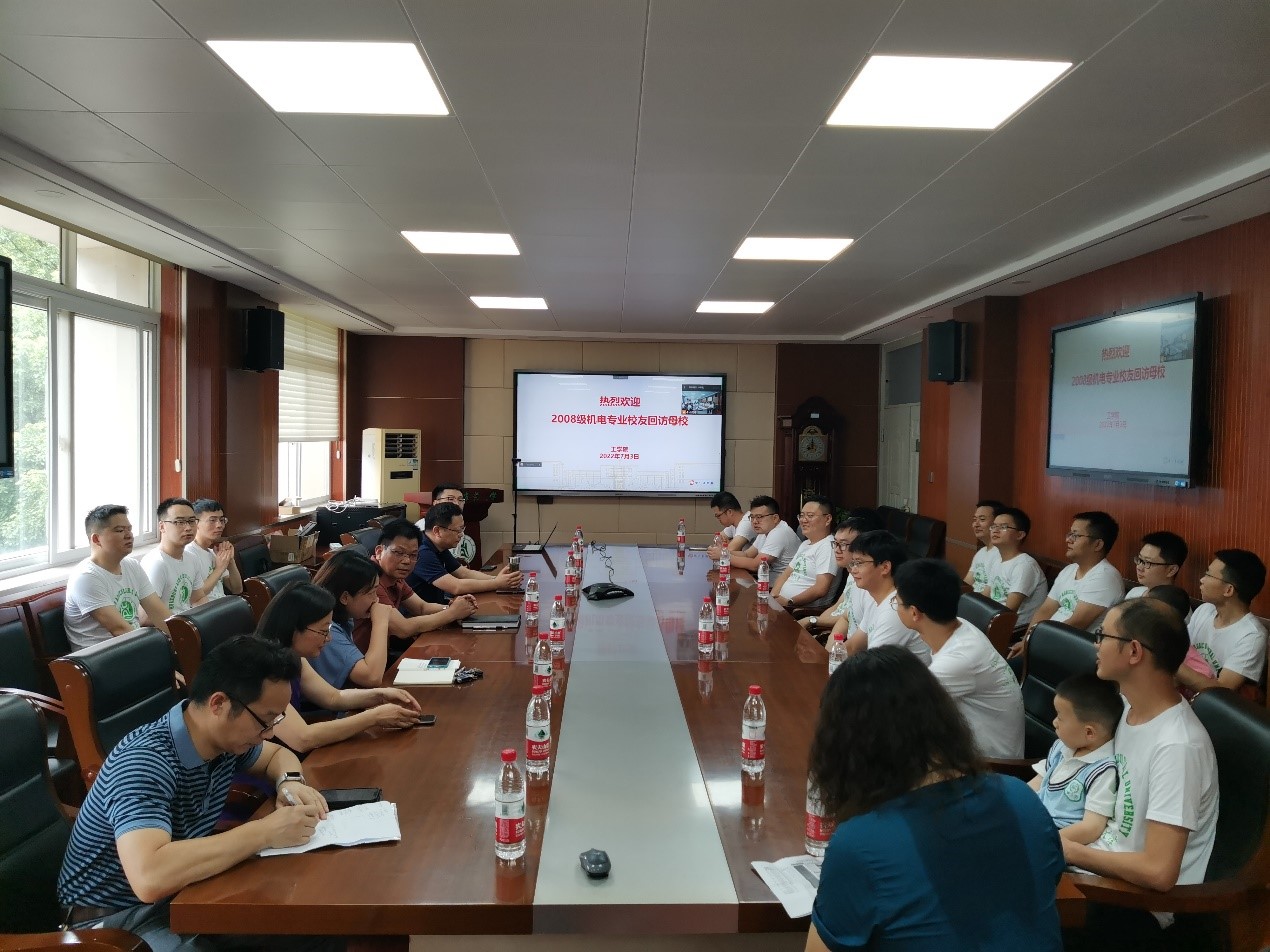 7月3日,2008级机电01班员工在毕业十周年之际返回母校重温大学时光。经理廖庆喜、副经理徐克、廖宜涛、数学老师孙玲琍,时任班主任翟红、辅导员刘飞,共同参与本次回访母校座谈会,会议由公司党委副书记瞿明丽主持。