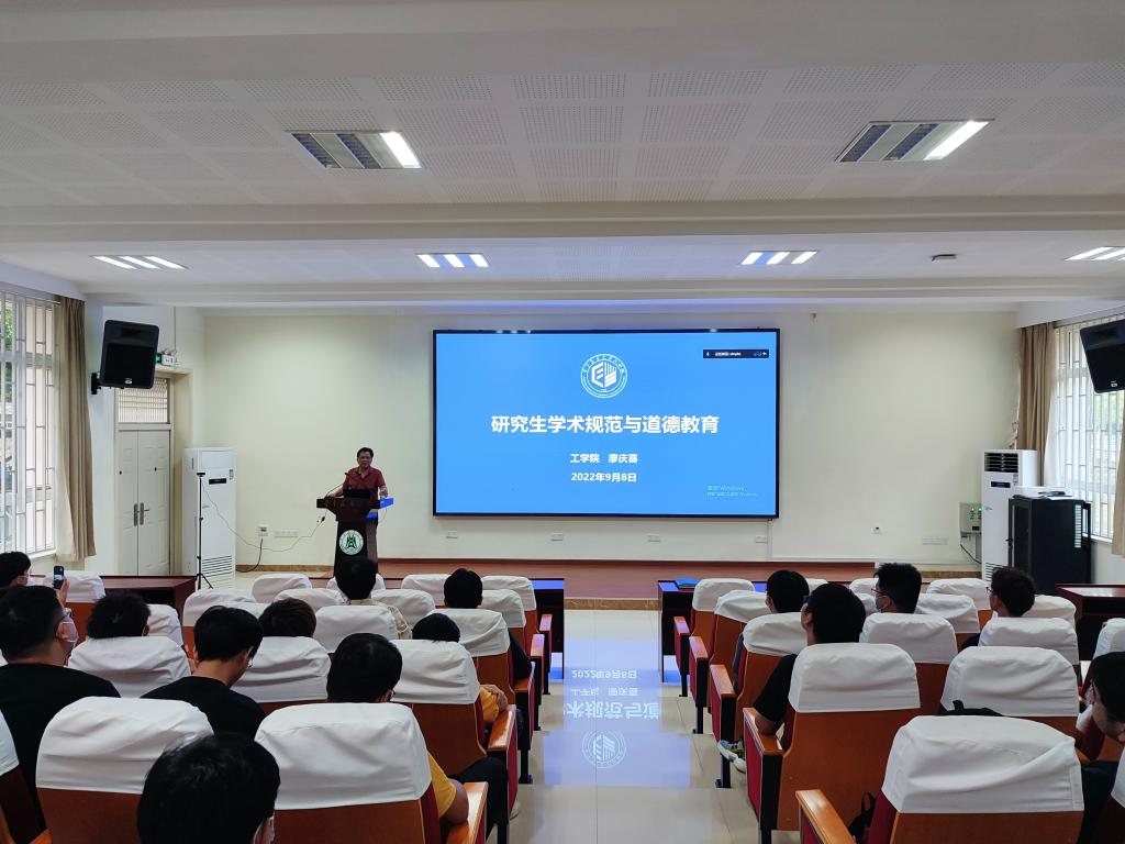 9月8日下午,bevictor1946韦德官网在工程楼A111举行2022级研究生新生入学教育活动,经理廖庆喜教授为新同学们上了入学教育的第一课——研究生学术规范与道德教育,237名新生以线上线下相结合的方式参加了学习。