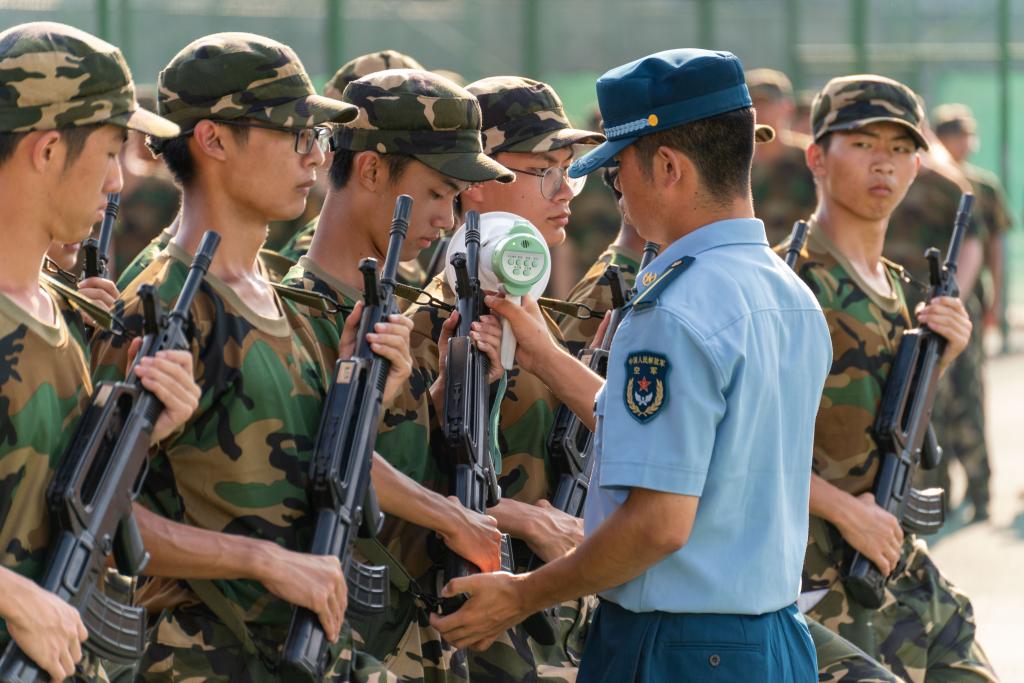 头顶炎炎烈日,手持仿真枪械,教官们结合工科专业,为同学们讲解95式自动步枪的设计理念、机械结构和发展历程,并演示正确的持枪姿势、“三点一线”的瞄准技巧和扣动扳机等动作要领。同学们认真体会其中的奥妙,在射击等待区摩拳擦掌、跃跃欲试。