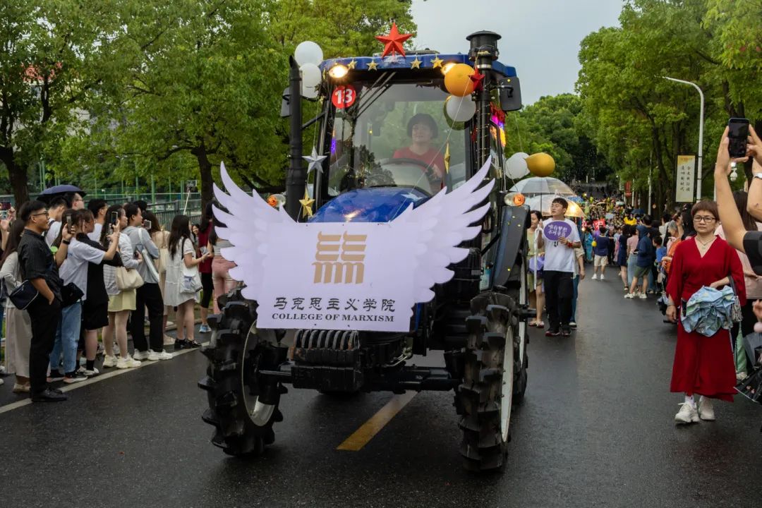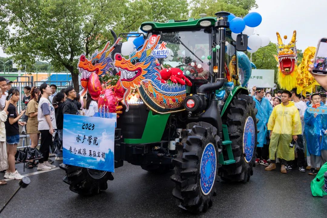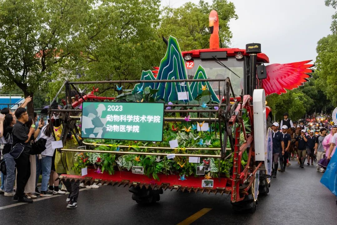 巡游队伍中,动物科学技术公司、动物医公司师生方阵格外惹人注目,9匹骏马由师生执缰骑行,彰显着动科动医学子“鲜衣怒马少年时”的蓬勃朝气,由公司自主研发的东方红割晒机车上,一只色彩鲜艳的火烈鸟振翅欲飞,以此祝福毕业生们永保内心的纯粹,坦途无畏、无惧风雨、追光逐梦!