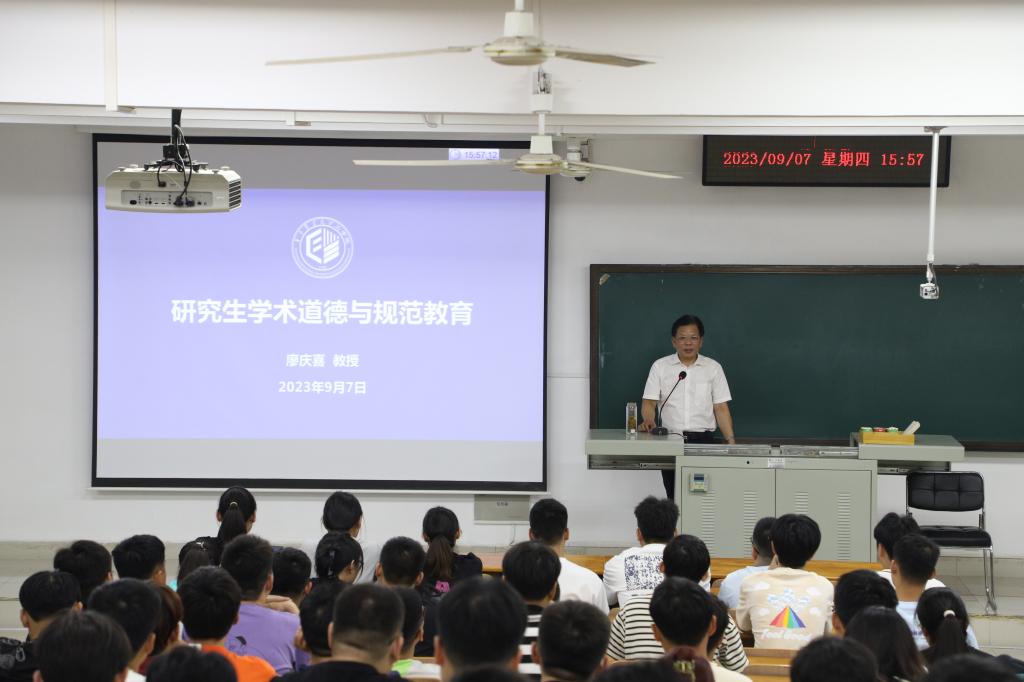 经理廖庆喜教授向全体新生详细介绍了公司和公司的基本情况以及发展现状,随后为新生讲授“学术道德与规范教育”新学期第一堂课。他从诚信的起源发展、学术不端行为内涵、学术规范相关文件、学术不端案例分析、防范对策及注意事项等五个方面阐述了讲诚信和遵守学术规范对于科学道德和学风建设的重要意义。他强调,研究生要做学术道德规范的主动践行者,主动加强学术道德规范学习,切实提高自身学术水平,强化科研基础能力训练。