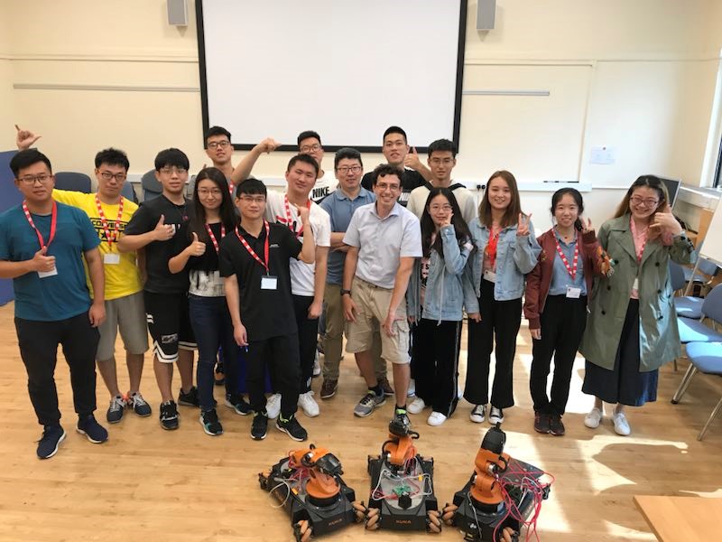 在第一周的学习过程中,卡迪夫大学物理科学与工程公司的Dr.Ze Ji向同学们讲述了ROS(Robot Operating System)平台、Kinematics分析和Python的基础知识,在其博士研究生Piatro的指导下,同学们学会了Linux系统的基本操作、模拟仿真和地图构建,并通过所学知识实现了对小型工业机器人KUKA的运动控制,课程取得了良好的效果,加深了同学们对机器人系统的认识和了解。