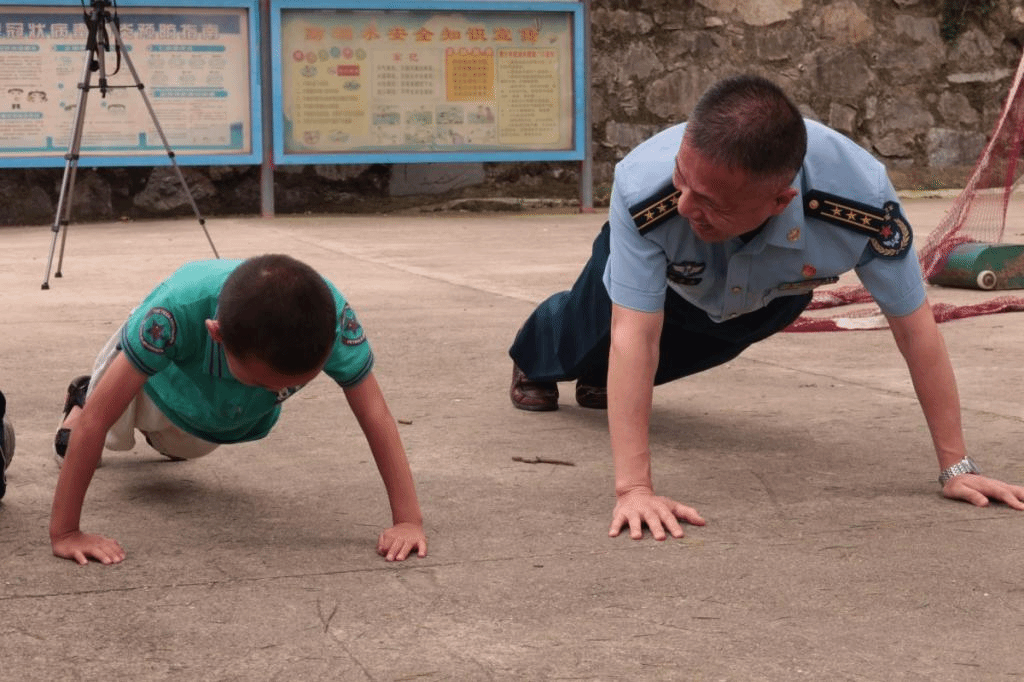 图为老兵爷爷和小朋友比赛做俯卧撑 冯伟明摄